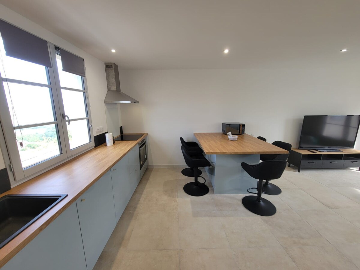 Мы предлагаем вам жилье на первом этаже, примыкающем к нашему семейному дому, и рядом с нашим другим домом Au Pigeon Voyageur. Она расположена в сельской местности, у подножия нашего голубца и каменной хлебопекарной печи, датированной 1613 годом, в небольшой деревне из 3 домов. Граулит - близлежащий город (8 км с 15 000 жителей). Из окон открывается исключительный вид на Пиренеи. Вы найдете типичные элементы региона, открытые каменные стены, паркет и деревянные балки.