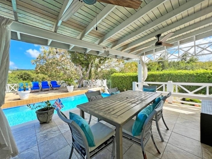 Fabulous, contemporary 3 bed 3 bath home with large garden and the best view of the Caribbean. Enjoy sundowners on the patio with an endless view of the Caribbean. This indoor/outdoor home was built to catch the cooling breeze. Recently updated, all bedrooms have A/C. The vaulted kitchen opens to the outdoor dining area and features high quality appliances and cookware. Located in a quiet location minutes from The Fish Pot. Ideal for families.