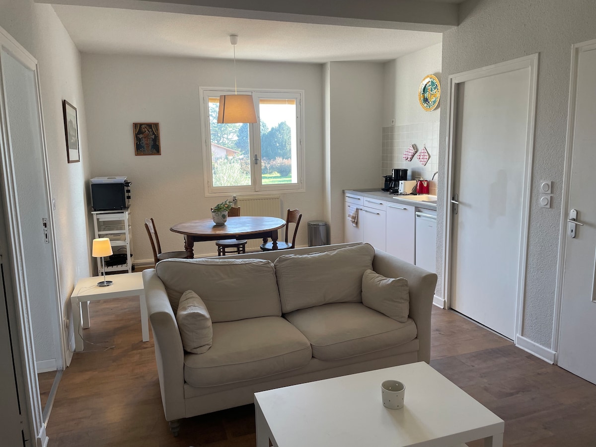 Квартира расположена к югу от Rhodanian Isere, в 2 км от шоссе A7. Он примыкает к нашему дому, но полностью независим. Площадь составляет около 35 кв. м на 2 этажах. На первом этаже находится главная комната с мини-кухней и гостиной с большим навесом с видом на двор. Сзади находится спальня с двуспальной кроватью. Наверху есть антресоль с еще одной двуспальной кроватью и ванная комната/ туалет. Обстановка тихая, бассейн находится в общем доступе.