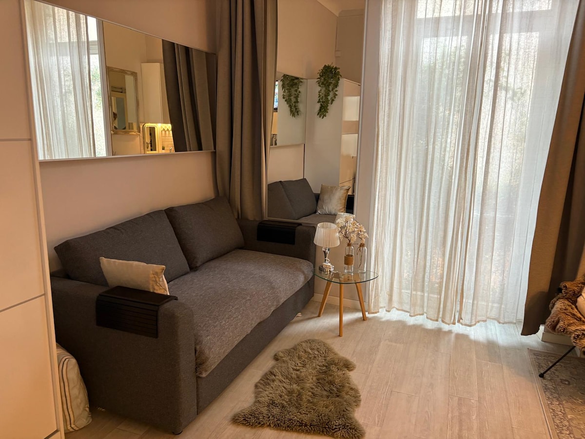 Редкая тихая студия, отремонтированная с видом на сад, сад, высокий потолок, центр в историческом районе класса Unco, все удобства, магазины, музеи, фитнес-транспортер Ванная комната и кухня отдельно от гостиной и комнаты. Кондиционер. Стиральная машина, Wi-Fi, телевизор, шкаф для хранения в 10 минутах от старого города, в 15 минутах от пляжей и порта. ИНФОРМАЦИЯ О ГИГИЕНЕ COVID 19: в студии проводится уборка при каждом отъезде с помощью продуктов sanytol и полированного пароочистителя, удаляющих 99,99% микроорганизмов.