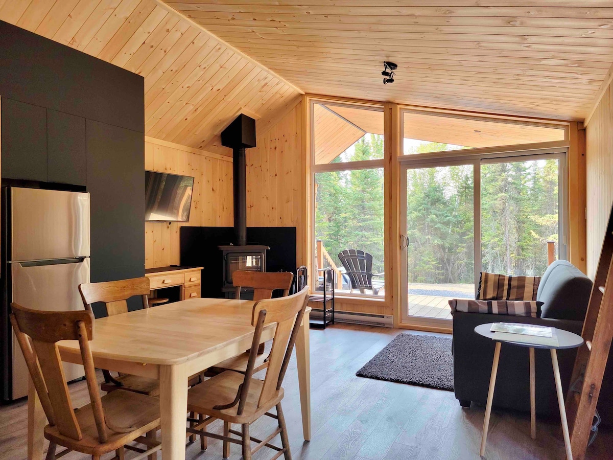 Small Scandinavian chalet for two people ideally located to enjoy the attractions of Charlevoix. It has a thermal circuit (hot tub, sauna, hammam) Very intimate and in the middle of the woods, the view overlooks the majestic river and the mountains in the distance. All the modern equipment is there and the comfort is absolute A/C and outdoor fireplace. The open concept design was designed for an immersive experience in nature: large windows, panoramic shower. Access via a private road at 500 m.