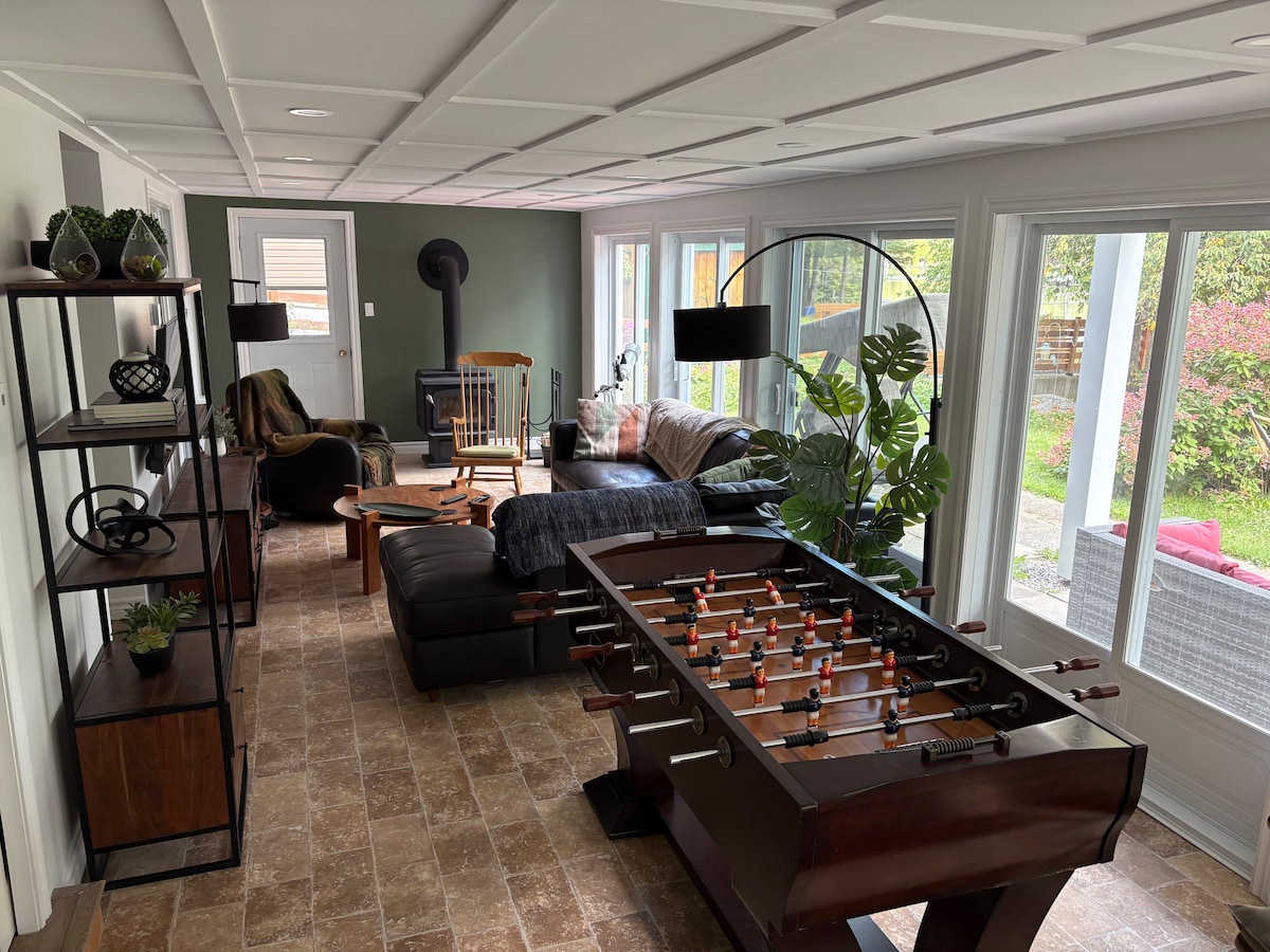 Новое жилье!! Насладитесь стильной атмосферой этого центрально расположенного места. Идеально подходит для 2 взрослых и 1 или 2 детей, потому что здесь также есть мини-сауна, аркадная видеоигра 1990-х годов с 150 играми, озеро, велосипедная дорожка, роликовые коньки, парк и водные игры перед домом. Любите снегоходы и квадроциклы? Расстояние до троп составляет 100 метров. Остановка такси-автобуса в 50 метрах. Бесплатная парковка. Магазин + бензин + 2 ресторана в 300 метрах.