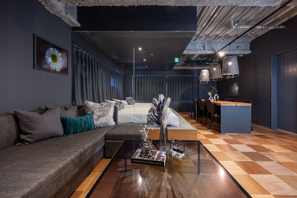 アウトサイダーアートを展示する「DISTORTION 9」は、2020 年 7 月オープンのギャラリーホテルです。 〈こちらは1階部分のみのご予約ページとなります。〉 1階バルコニーの露天風呂も含めてプライベートでご利用いただけます。屋内にはシャワールームもあります。 最大 4 名様までご宿泊可能ですが、もし2 フロア(1階と2階)を貸し切りで予約したい場合は最大 8 名様までご宿泊いただけます。2 フロア貸し切りをご希望の場合は予約前にお問い合わせください。 ギャラリーとして展示している作品は、滋賀県甲賀市にあるアートセンター&福祉施設「やまなみ工房」で日々創作されるアウトサイダーアート。館内で展示している作品だけでなく、ホテル前の自動販売機ではオリジナルパッケージアートもご購入いただけます。室内にある大画面TVでアマゾンプライムの映画をご覧いただけます。 また、おそらく大阪難波唯一の露天風呂付客室です。水着を着用していただいたり、カーテンを閉めてゆっくりリゾート気分を満喫してください。
