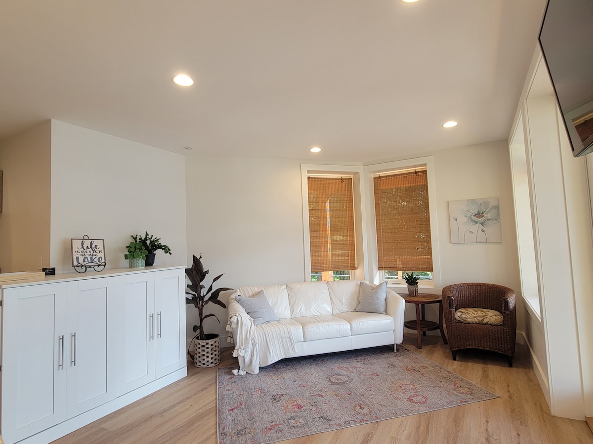 В тихом районе, прекрасный, частный, кондиционированный домик со сводчатым потолком и стеклянным фасадом с видом на пролив Бейнс-Саунд и горы острова Ванкувер. Автономный с отдельным входом. Кровать размера Queen size в лофте, односпальная кровать на первом этаже. Отдельная ванная с душем. Отдельный выход на пляж. Рядом с паромом, в нескольких минутах ходьбы от местной деревни. Обратите внимание, что жилье не подходит для людей с ограниченной мобильностью или маленьких детей. МЫ НЕ ВЗИМАЕМ ПЛАТУ ЗА УБОРКУ.