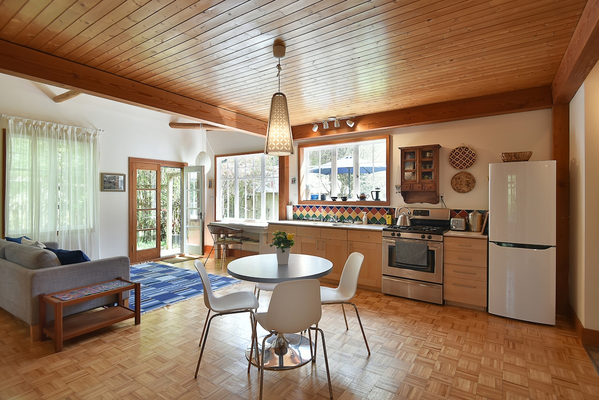 Уютная крошечная хижина площадью 240 кв. футов со всем необходимым, включая стиральную машину/сушилку, небольшую духовку, холодильник и микроволновую печь. В распоряжении гостей душ в помещении и сезонный душ на открытом воздухе (горячая и холодная вода, май–сентябрь). Частная терраса, гостиная и пропановая костровая яма. Прогуляйтесь до Палм-Бич и тропы Саншайн-Кост. Магазин товаров повседневного спроса/алкогольных напитков рядом. 15 минут до парома в Солтери-Бей, 20 минут до парома в Комокс.