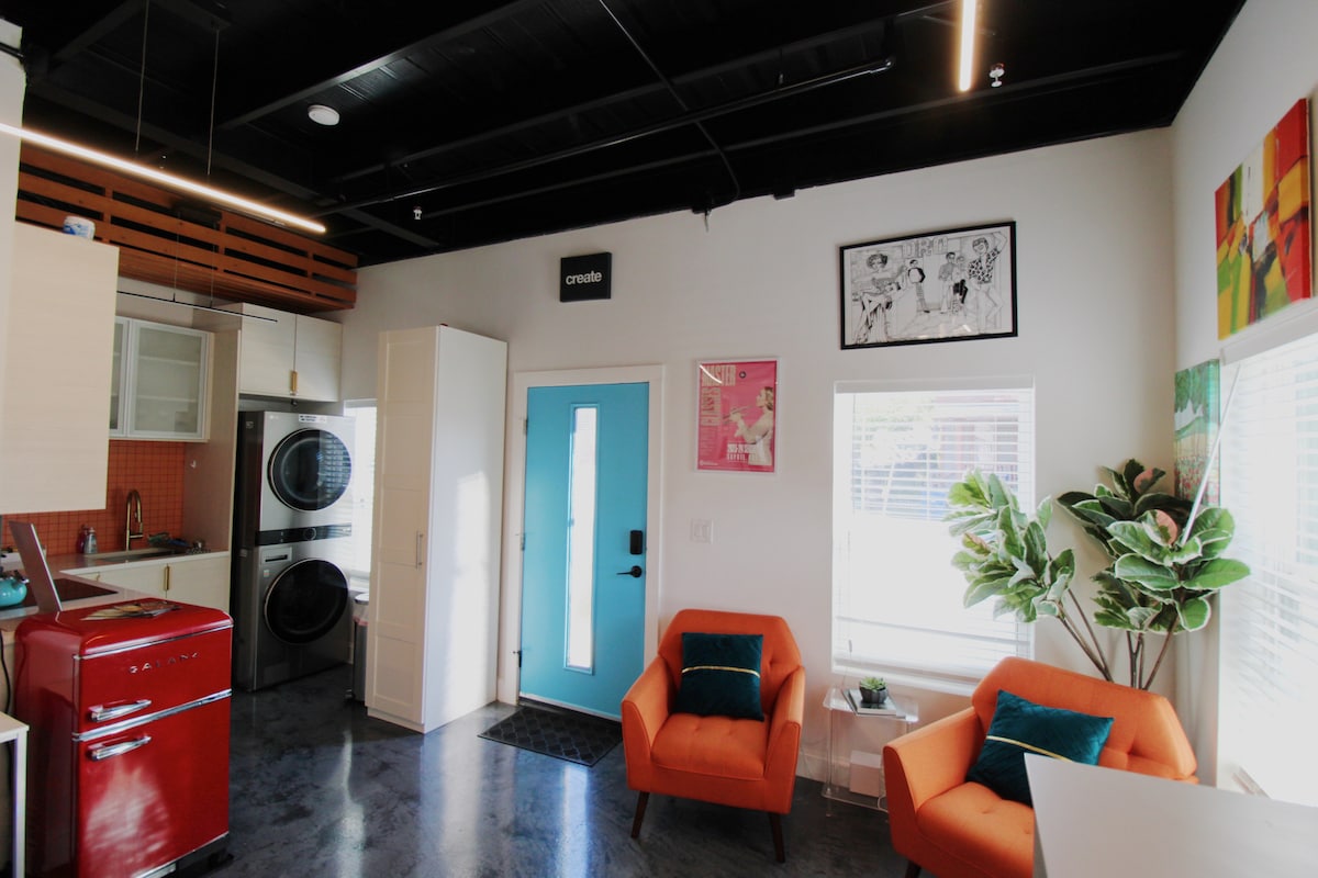Welcome to our Studio! This stylish ground floor studio apartment (built in 2023) is just steps away from Downtown, San Antonio, the Alamo and the River Walk. Highlights: + Private entrance and back door + Modern finishings + Concrete Floor + High ceilings + Beautiful kitchen + Queen sized bed + folding twin bed (available for 3ppl groups) + Spa bathroom with rain shower + New LG washer & dryer + Fridge and freezer