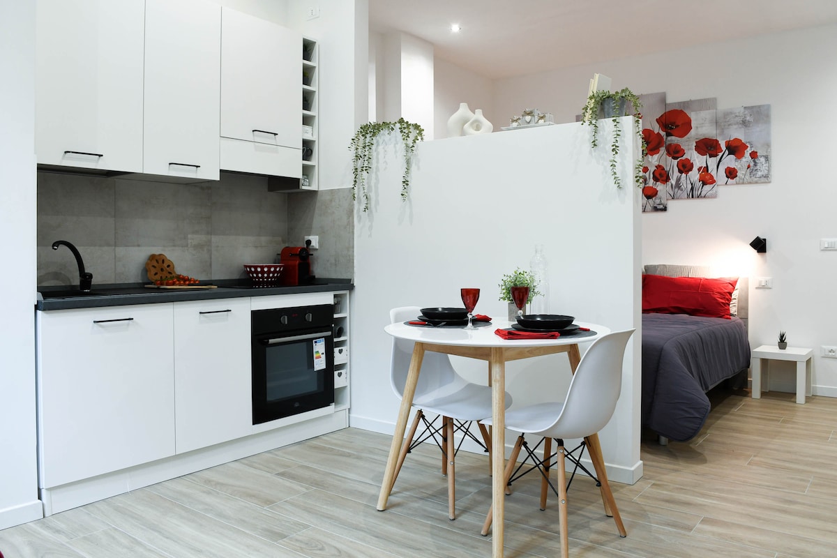 Enjoy a vacation or a business trip in style and comfort in this delightful studio apartment. Independent entrance in a small private courtyard, from a dead-end street. Access to the dining area with sofa (also a bed) and dining table. A small wall separates the dining area from the sleeping area where there is a double bed and wardrobe. Then you enter a hallway where there is a washer-dryer and from which you access the bathroom, modern and functional (blind, but with extractor fan).