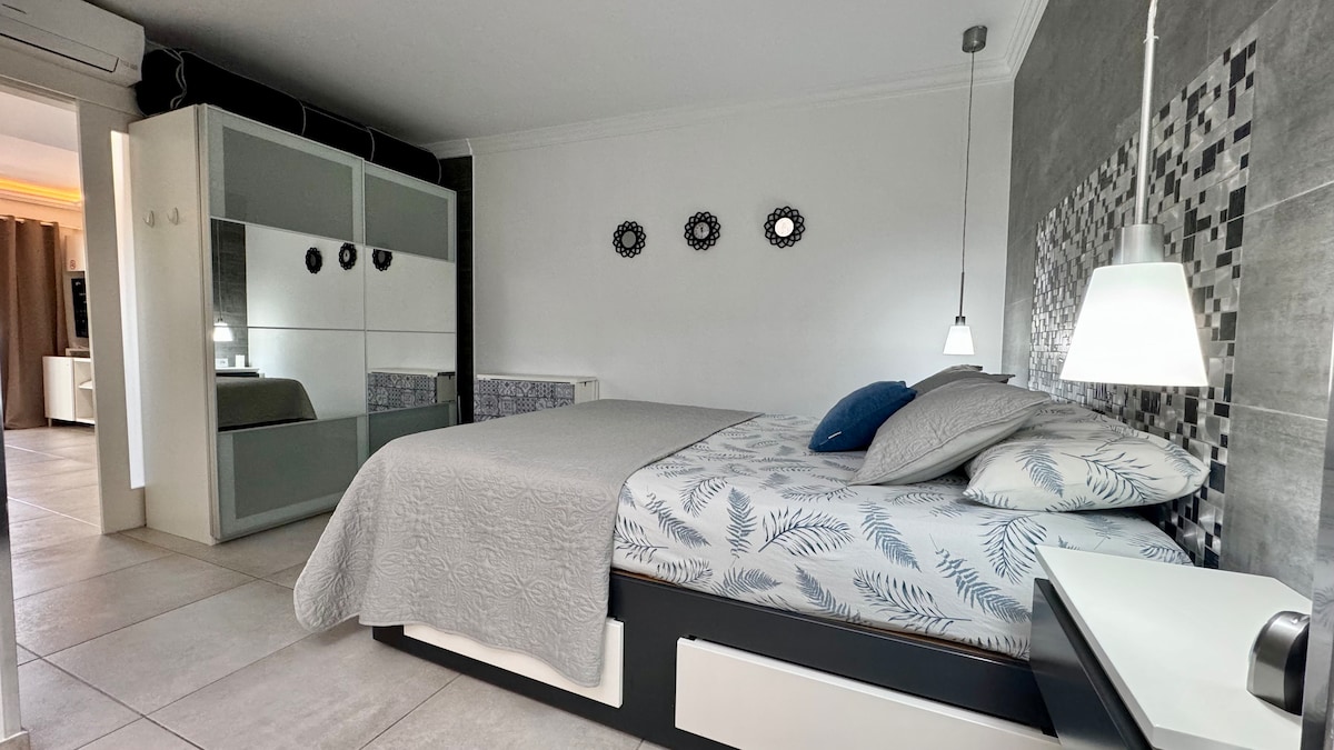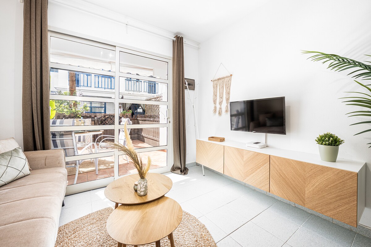 Добро пожаловать в нашу новую квартиру с 1 спальней на проспекте De Tirajana, всего в 5 минутах от Yumbo. Наслаждайтесь современным комфортом с уютной спальней, полностью оборудованной кухней и стильной гостиной со Smart TV. Просторный балкон идеально подходит для отдыха на свежем воздухе. Благодаря высокоскоростному Wi-Fi, кондиционерам и предметам первой необходимости вы почувствуете себя как дома. Квартира рядом с кафе, ресторанами и общественным транспортом идеально подходит как для отдыха, так и для деловых путешественников. С нетерпением жду вас!