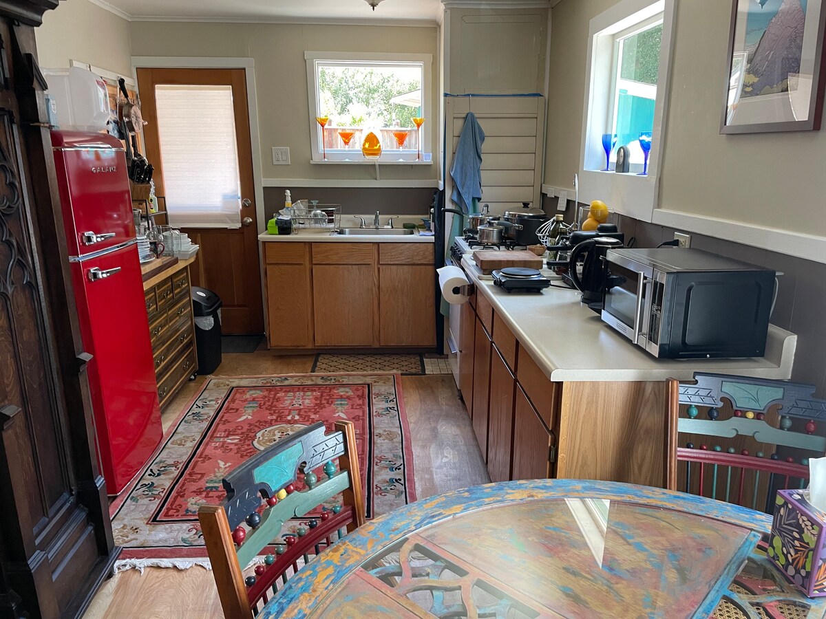 Удобная и частная отдельно стоящая студия с большой террасой. Студия расположена в роще живых дубов, и из нее открывается вид на причудливый цветочный сад. Это B&B, где предлагают кофе, чай, свежие фрукты, овсянку, гранолу, сок, молоко, овсяное/миндальное молоко и т. д. Это огороженное жилье, а большая частная крытая терраса обеспечивает безопасное хранение гостевых велосипедов и спортивного инвентаря. Местные карты троп для ваших пеших и велосипедных приключений!