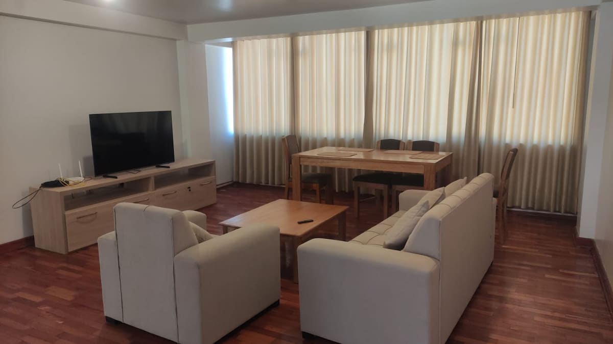 Bright, modern and fully equipped flat with great views in a safe residential area of Cusco. Ideal for couples or travelers looking for comfort, great views and easy access to shops, restaurants and main avenues. Located in a modern and secure building, just 10 minutes by car from both the historic center and the airport. Set in a quiet residential area, yet close to all kinds of shops, it allows you to get around easily and have every convenience within reach.
