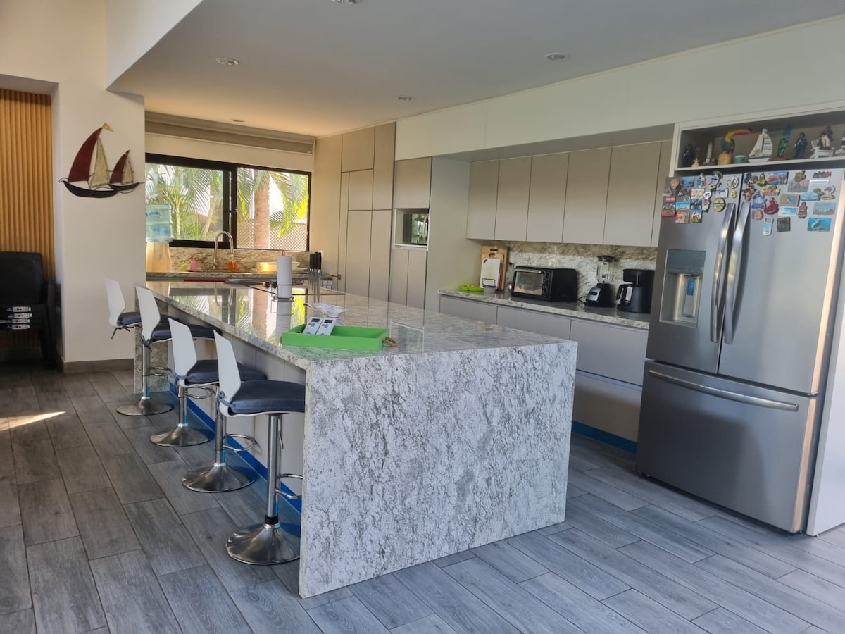 Disfruta en esta hermosa casa pensada específicamente para consentirte. Casa de 3 habitaciones, aire acondicionado en todas las áreas, Wifi, acceso a la playa dentro del mismo condominio y piscina privada. Equipada para 12 personas, refrigerador, hornos, cafetera y una churrasquera; Sala y comedor en la pérgola para disfrutar de un delicioso churrasco. Ubicada dentro de garita en condominio Marena (A unos metros del hotel Soleil) para que tu estadía sea segura y tranquila. Personal de apoyo.