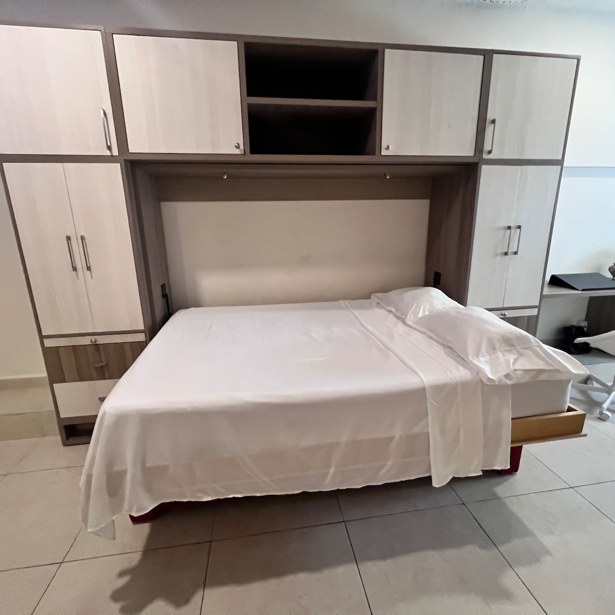 Estudio de 33m2, ideal para un viaje corto a la zona de Santa Fe, cuenta con 1 cama king, smart tv, barra de servicios (microondas), smart tv con internet y baño propio. El espacio lo recomiendo para viajeros que buscan pocas noches de hospedaje. Limpieza diaria y 1 cajón de estacionamiento incluido. **El espacio no se compate con nadie*** **Edificio con seguridad y recepción 24/7**