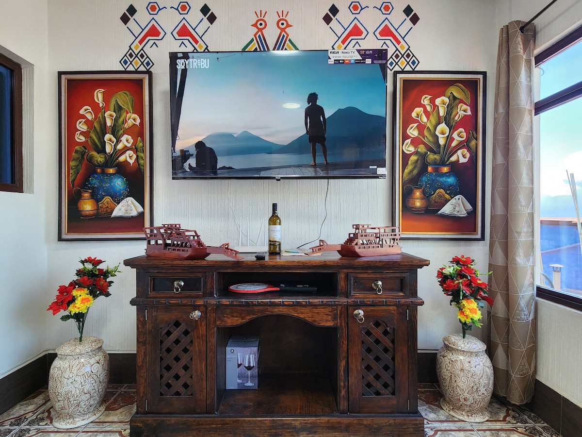 Enjoy breathtaking panoramic views of Lake Atitlán, its surrounding volcanoes, and mountains from your artisanally designed sanctuary. Wake up to epic sunrises and birdwatching while lounging on the sofa or a queen orthopedic mattress. The house features a chef-designed kitchen, handcrafted decor, WiFi, 1.5 baths, a hot shower, and easy access to hiking and yoga. A 7-minute walk or short tuk-tuk ride from central San Marcos. Ideal for couples, creatives, digital nomads, and nature lovers.