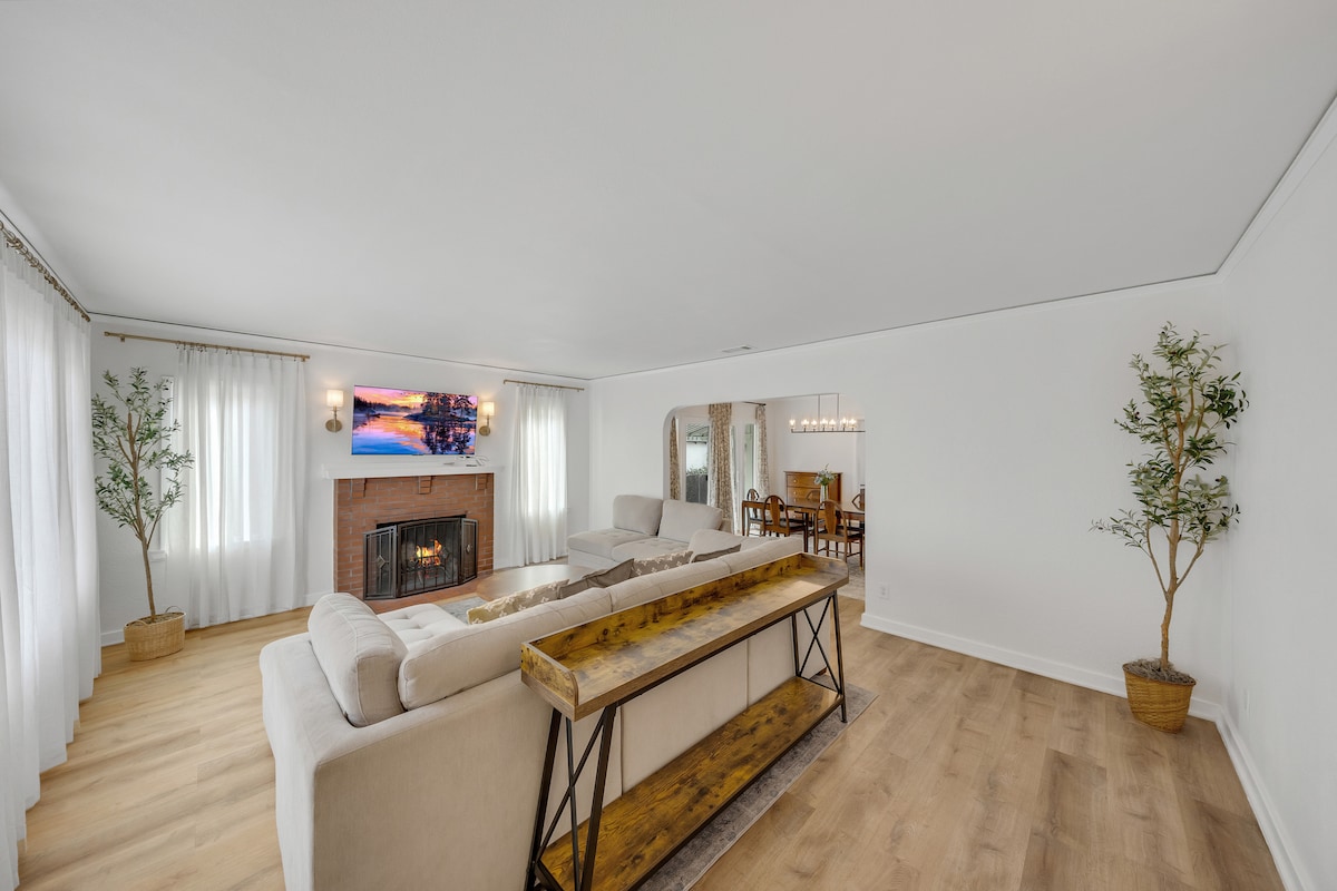 This 1-bedroom/1-bathroom house is 15-20min drive from Dodger Stadium. Built in the early 1940s, its decor is a nod to that era's timeless charm. Blackout drapes enhance the sleeping areas for a restful night's sleep. The beverage bar features ample cabinetry, an accent wall with backsplash, and unique open live edge shelves, crafted from the old avocado tree that once graced the patio. The patio has since been transformed with outdoor furniture, making it perfect for leisurely moments outdoors.