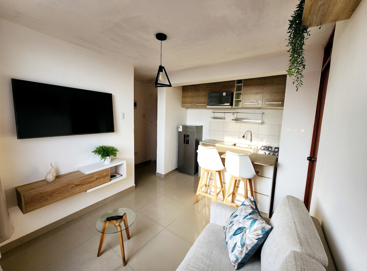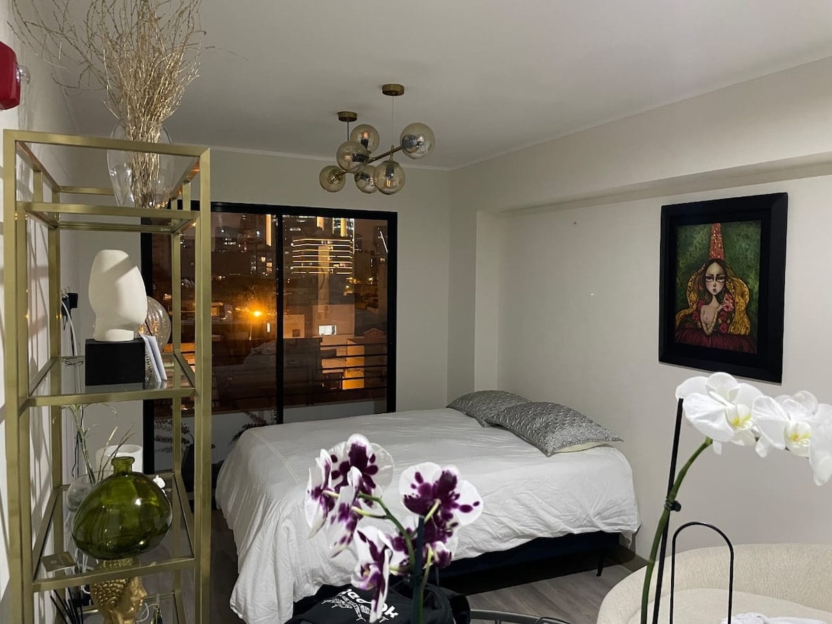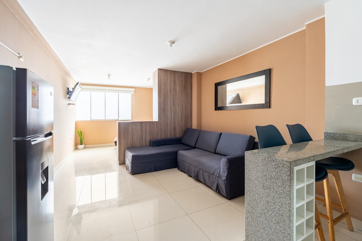 Уютная и безупречная квартира площадью 60 кв. м в центре Мирафлорес, в нескольких шагах от парка Кеннеди, Ларкомара и Малекона. Главная спальня с двуспальной кроватью размера Queen size, письменным столом, 42-дюймовым телевизором Smart TV, Wi-Fi, ванной комнатой. Открытая кухня, гостиная и полноценная столовая. Ванная комната с 1/2 ванной комнатой. Остановившись здесь, вы можете чувствовать себя спокойно, всегда следуйте расширенному протоколу уборки Airbnb. Во время вашего пребывания будут доступны дополнительные чистящие средства.