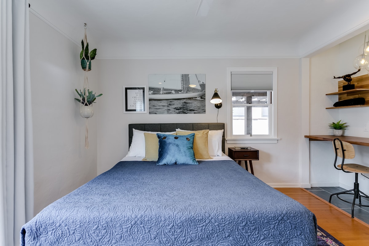 Stroll into Long Beach with this remodeled 1920 bungalow and savor the several waterfront attractions: from restaurants, bike-friendly roadways to many miles of sandy beach. Come back home to a serene haven with exquisite furnishings and fix a quick meal in the sleek kitchen with marble tops. Retreat to a comfy classical king bed, queen bed or bunk bed. For a magical night, light up the backyard firepit and enjoy some al fresco stargazing with festoon lights illuminating the private backyard.