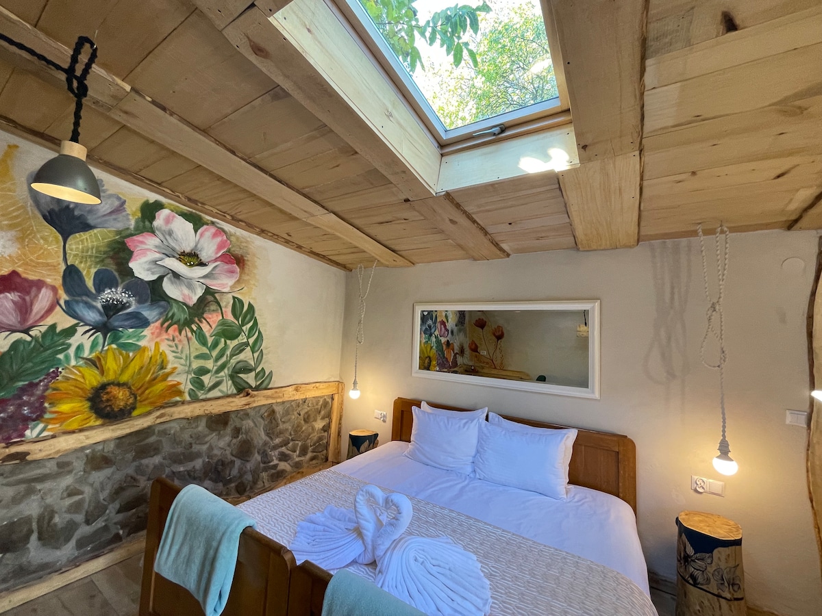 Zapraszamy do pokoju "Kwiaty" w agroturystyce Wakop 6 – idealnego miejsca na romantyczny wypoczynek w sercu Gór Świętokrzyskich! Ciesz się wyjątkowym klimatem tego przytulnego wnętrza, gdzie drewniane deski na suficie i okno, przez które można podziwiać gwiazdy, tworzą niepowtarzalną atmosferę. Ciepło kominka napalanego drewnem doda uroku Twoim wieczorom. Mała i przytulna łazienka zapewni pełen komfort. Spędź niezapomniane chwile blisko natury i zarezerwuj już dziś!