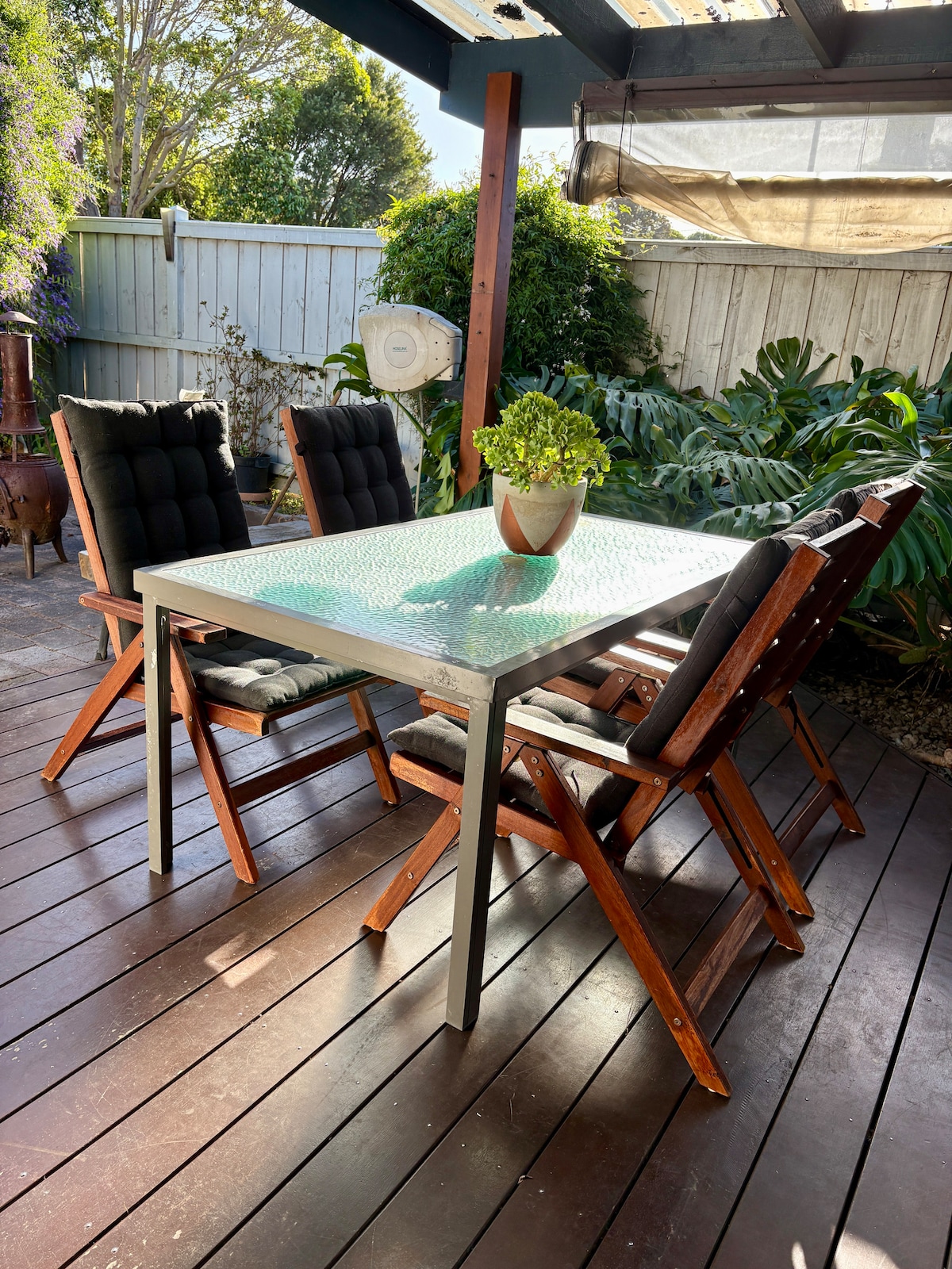 Light, bright and spacious. From the moment you walk in you'll feel calm and relaxed. Fire up the wood fire or simply press a button for instant warmth or cool. Comfy Koala mattresses on beds also equipped with electric blankets. Clean, white stone bench tops and a large cooktop and oven if eating-in is your plan. Stylish and comfortable living spaces. Streamlined bathroom and ensuite, each with a large glass-walled shower. Enjoy the grassy front deck area or sit around the fire pit at the back.