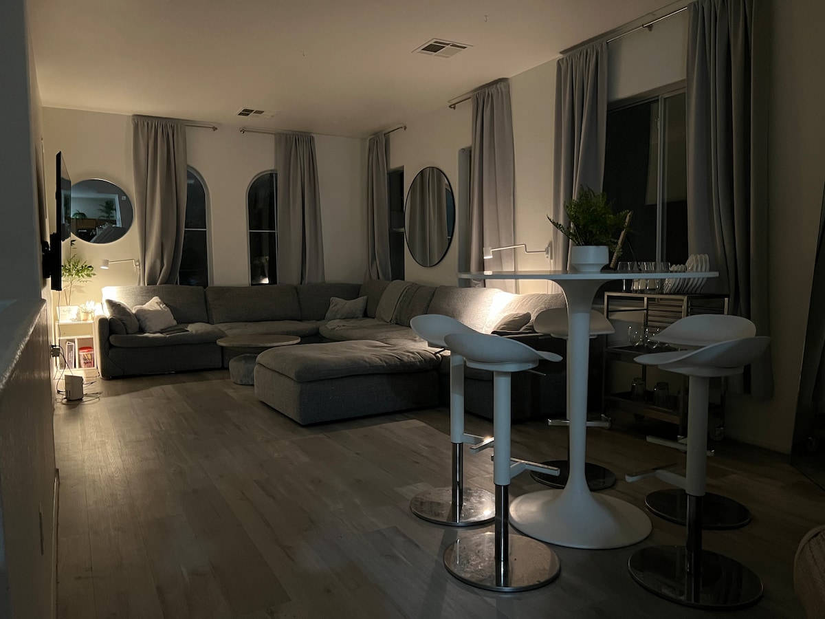 Спокойный отдых в пригороде Лас-Вегаса недалеко от красивого каньона Красной скалы. Наслаждайтесь отдыхом вдали от суеты, сохраняя при этом все под рукой. Закрыть одну уличную дорогу до Стрипа. В нескольких минутах ходьбы находятся удивительные магазины, бары и совершенно новый магазин Whole Foods. Специальные жалюзи в спальнях, которые простираются от пола до потолка. Большие плоские телевизоры 4K, аудиосистема объемного звучания и самый быстрый Wi-Fi.