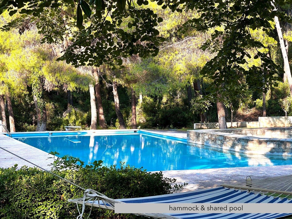 Дом для отдыха с двумя спальнями в сосновом лесу Сани. В обеих спальнях есть кондиционеры и потолочные вентиляторы, уютная гостиная с диваном-кроватью и полностью оборудованная кухня, а также просторная веранда для ужина на свежем воздухе с видом на лес и сад. Ближайший пляж идеально подходит для семей и до него можно добраться пешком или на машине (750 м), а магазины и рестораны находятся менее чем в 10 минутах езды. Есть бесплатная парковка.