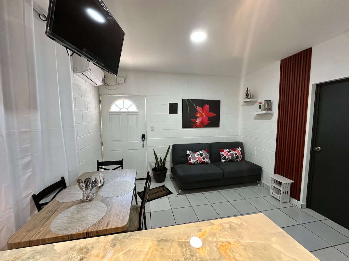 Moderno y lujoso alojamiento en el corazón de Santa Ana. Disfruta de una habitación totalmente climatizado, baño completo, cocina equipada, sala cómoda y elegante, y un encantador patio con comedor al aire libre. Además, cuenta con área de jardín y zona de lavado. Todo lo que necesitas para una estadía cómoda en una ubicación inmejorable, cerca de restaurantes, tiendas,gimnasio y atracciones locales. Ideal para descansar o explorar la ciudad.