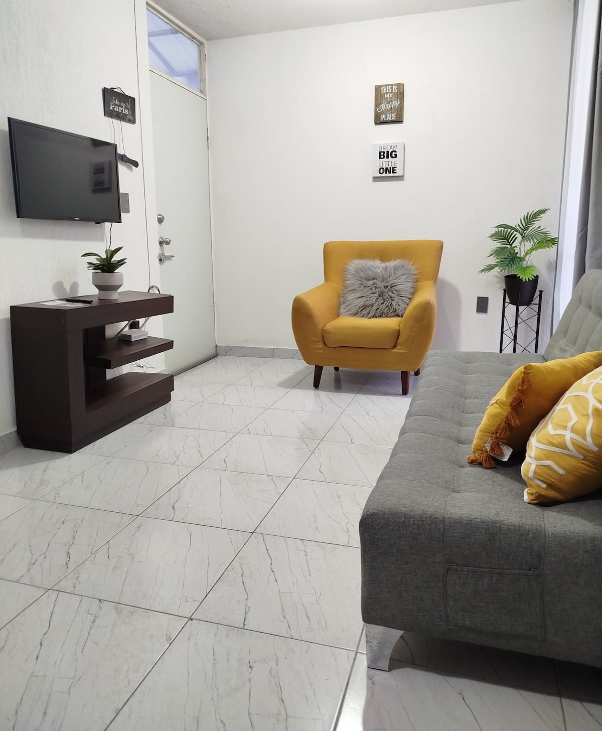 Современные, безопасные апартаменты с кондиционером и 2 спальнями (одна двуспальная кровать и две односпальные кровати с качественными матрасами), идеально подходят для 4 человек. Гостиная со Smart TV, диваном-кроватью, быстрым Интернетом, ванной комнатой и оборудованной кухней. На втором этаже с балконом и видом на горы. 5 минут от консульства, La Huasteca, Vía Cordillera, UDEM и Tec Santa Catarina. Выставлен счет
