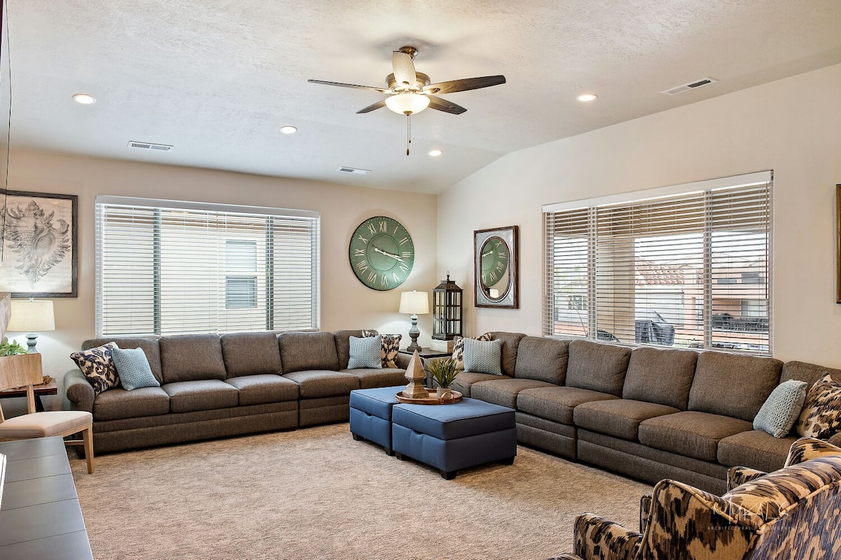 MAKIN' MEMORIES is an XL 6 bathroom, 4 bedroom townhome that sleeps 16 people. There is a huge deck with a private hot tub and views of the Red Rock Mountains! The amenities include Kid's Cove water park pools, water slides, hot tubs, gym, clubhouse, volleyball, & pickleball. All 6 flat-screen TVs have WIFI access. All the bedrooms have their private direct-access bathrooms for privacy when you need it. The open kid's loft is a ton of fun!. All 4 primary suites have king beds.