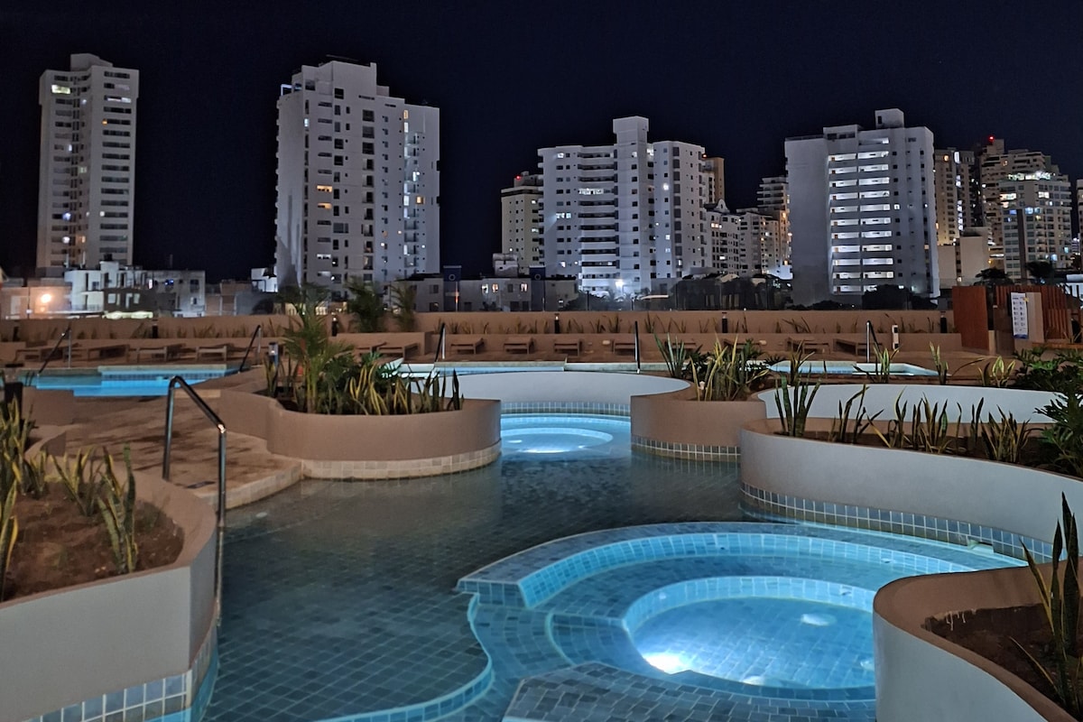 Отдохните в роскошном люксе в Санта-Марте, всего в нескольких шагах от прекрасных пляжей Сальгуэро и Родадеро. Идеально подходит для пар или семей, здесь комфортно размещаются от 1 до 4 гостей. Частная круглосуточная охрана, полностью оборудованная кухня, затемнение, вход без ключа, кондиционер, отдельный балкон с потрясающим видом, 58-дюймовый Smart TV, одна дополнительная двуспальная кровать и удобный диван-кровать, 2 бассейна, тренажерный зал, стол для пинг-понга и бильярдный стол, коворкинг-зона, а также близость к торговым центрам и множеству ресторанов!