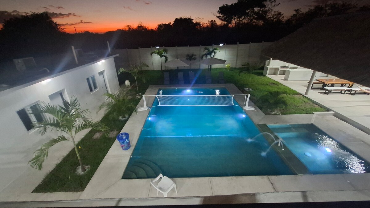 Максимум 20 человек 5 комнат с собственной ванной комнатой, шкафом и кондиционером. 6 двуспальных кроватей и 8 имперских кроватей Спальная зона с 4 гамаками Кухня С островом для завтрака И столовой. Гостиная с телевизором, Wi-Fi и диваном. 1 открытая столовая с телевизором Churrasquera, креслами и кучей. 2 дополнительные ванные комнаты в общих зонах Бассейн Парковка на 5 машин Дом находится в 100 метрах от пляжа, примерно в двух кварталах. Aldea El Banco в 15 минутах от центра Монтеррико Санта-Роза, в 30 минутах после моста Истапа.