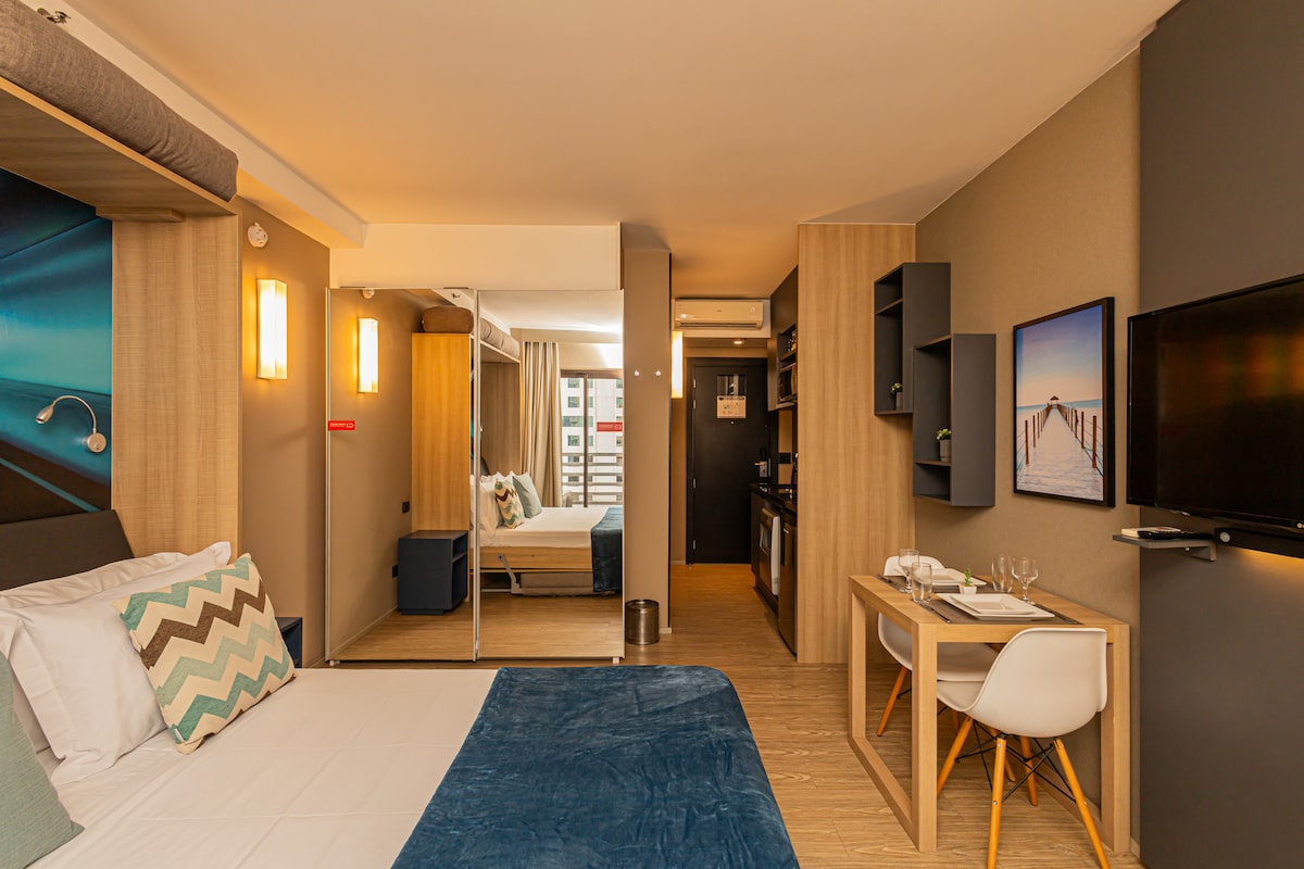 Полностью оборудованная студия в закрытом кондоминиуме с отличной структурой и расположением в безопасном районе недалеко от Альфавилла. В студии есть быстрый Интернет, Android TV, кухня, двуспальная кровать размера Queen size, мини-бар, постельное белье, полотенца, фен, бытовые принадлежности и парковочное место. В кондоминиуме есть прачечная, круглосуточный мини-маркет, бассейн, тренажерный зал и стойка регистрации. Рядом рестораны, пекарня, гамбургер, пиццерия, бары, аптека, рынок - все очень близко без автомобиля.