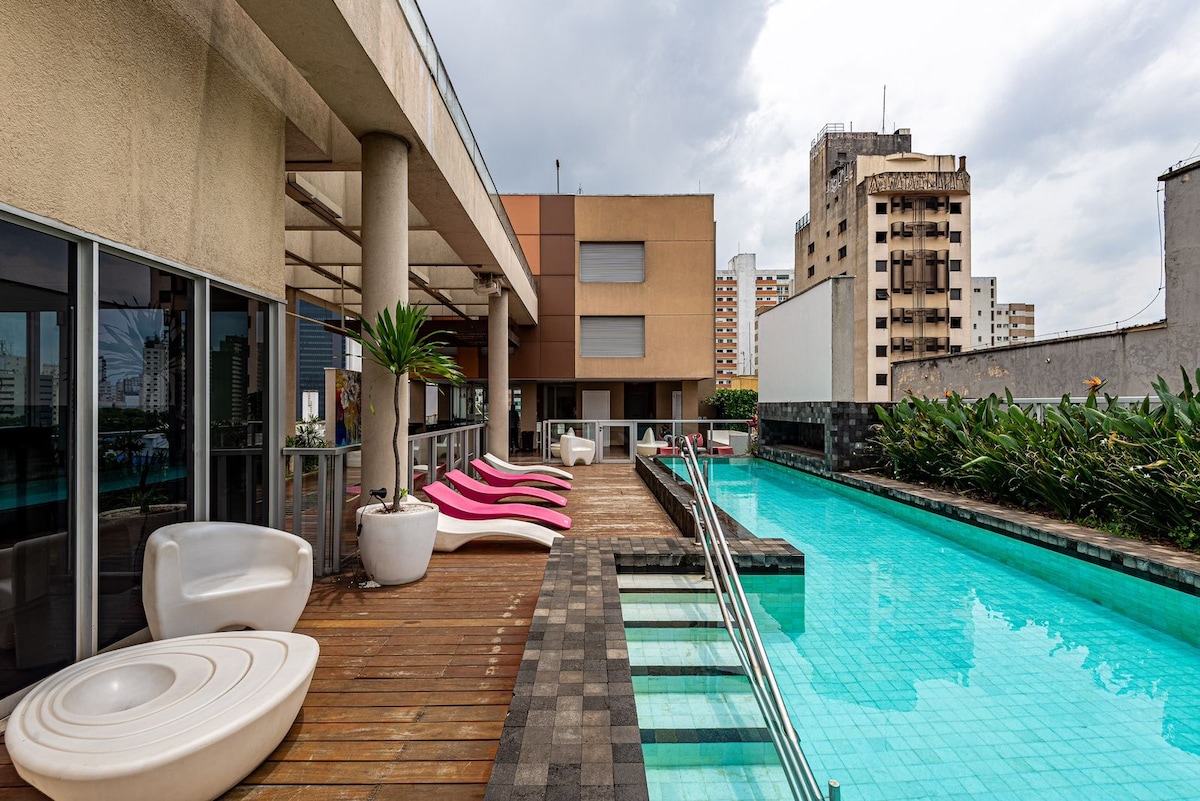 Estúdio espaçoso com muito design, arquitetura e a melhor vista de São Paulo. Loft completo! Com cama queen, closet, ar condicionado silencioso, cozinha completa, home office, WI-FI, TV 55” e uma belíssima banheira de imersão, de onde pode apreciar o seu drink preferido e curtir uma vista apaixonante. São Paulo toda estará há poucos minutos de você. Acesse o metrô andando apenas 200m. Reserve com tranquilidade! Proporcionaremos uma excelente hospedagem e uma ótima experiência!