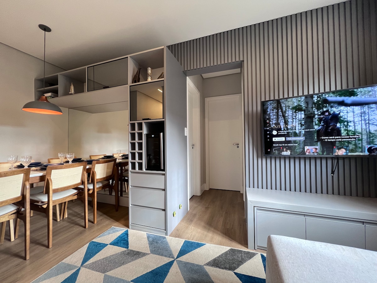 Красивая квартира в Кампус-ду-Жордан. Наш небольшой уголок в Серра-да-Мантикейра оформлен в современном стиле и прекрасно вмещает 4 человек, так как в нем установлены две двуспальные кровати.Мы предоставляем постельное белье и полотенца. У нас есть 2 ванные комнаты с душем с газовым подогревом для максимального комфорта. Наша кухня полностью оборудована, у нас есть вся посуда для приготовления любых блюд. Мы находимся в 3 км от туристического центра, на машине это 7 минут с прекрасным видом, на вершине Морро-ду-Элефанте.