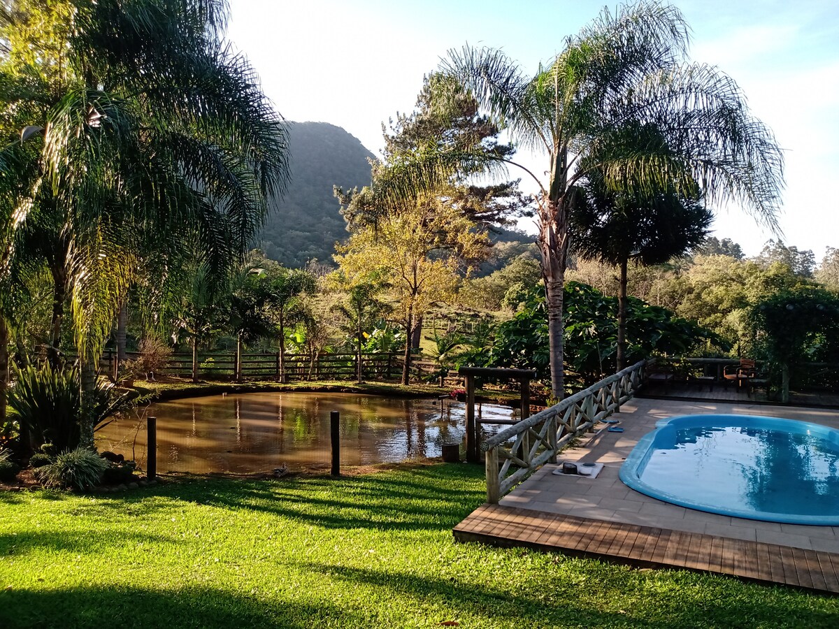 Local de fácil acesso em área rural, próximo ao centro budista, casa de dois pisos aconchegante, sacada com vista panorâmica da suite, visualização de animais silvestres e com animais domésticos na propriedade, ampla sala de jogos com lareira, garagem fechada para dois carros, cozinha ampla com churrasqueira, fogão campeiro a lenha com vista panorâmica para o vale, quiosque com churrasqueira e piscina, lago próximo ao portão de entrada local muito utilizado para fotografias.