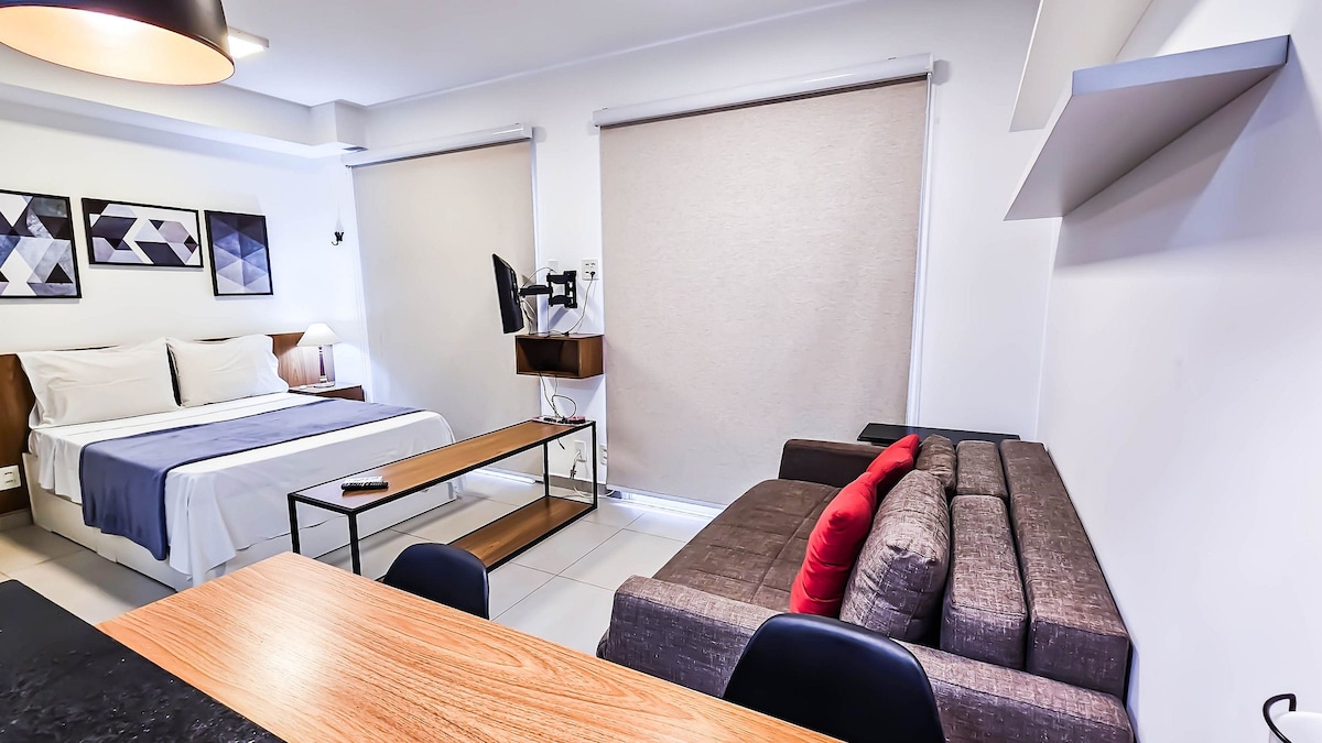 No prédio há 4 restaurantes, localização que permite fácil acesso em área nobre. Temos internet vivo fibra 50 Mega no apartamento. O apartamento é novinho, todos os móveis e eletrodomésticos são novos! Temos geladeira, microondas, cafeteira , Smarttv O apto é no 2° andar, há 3 elevadores à disposição. Há 1 vaga de garagem coberta gratuita. Disponibilizo um fogão elétrico pequeno, de 2 bocas. O uso da área de lazer é possível apenas para hospedagem por período superior a 3 meses.