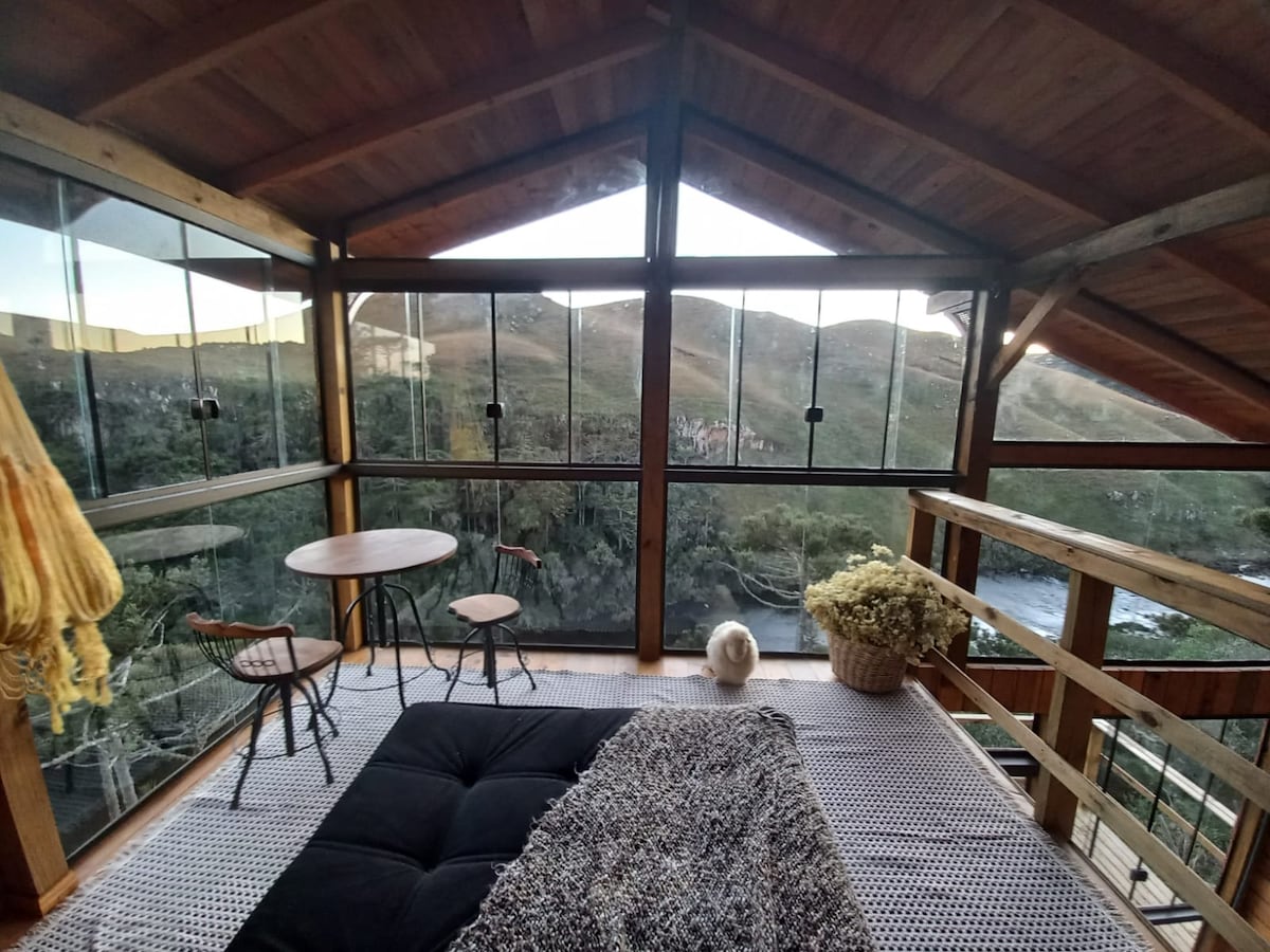 Стеклянная зона в Шале, пространство для гурманов с барбекю и невероятным видом на закат. В центре полей над горами, но рядом с городом ... отличное место для отдыха после дня осмотра достопримечательностей в каньонах и водопадах региона , нет ничего лучше, чем расслабиться в гамаке или насладиться закатом у костра, а в самые холодные дни насладиться уютным камином. Ваш питомец также приветствуется здесь. obs: завтрак Exelente по желанию, не включен в суточную ставку.