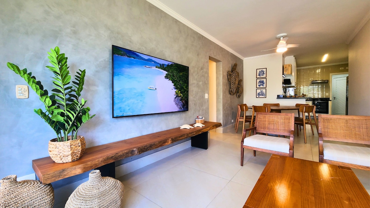 ** Possibilidade de datas e opções de viagem com valores melhores e condições especiais. Entre em contato no chat.** Apto moderno e confortável com churrasqueira, varanda gourmet com Fechamento em Vidro e vista parcial para o mar. Situado ao lado da entrada da praia, no módulo 7, possui Serviço de Praia diário, Wi-Fi rápido, Piscina Aquecida, 1 suíte master com cama queen, e 1 quarto amplo com 4 camas de solteiro. O apto possui Ar Condicionado em todos os ambientes.