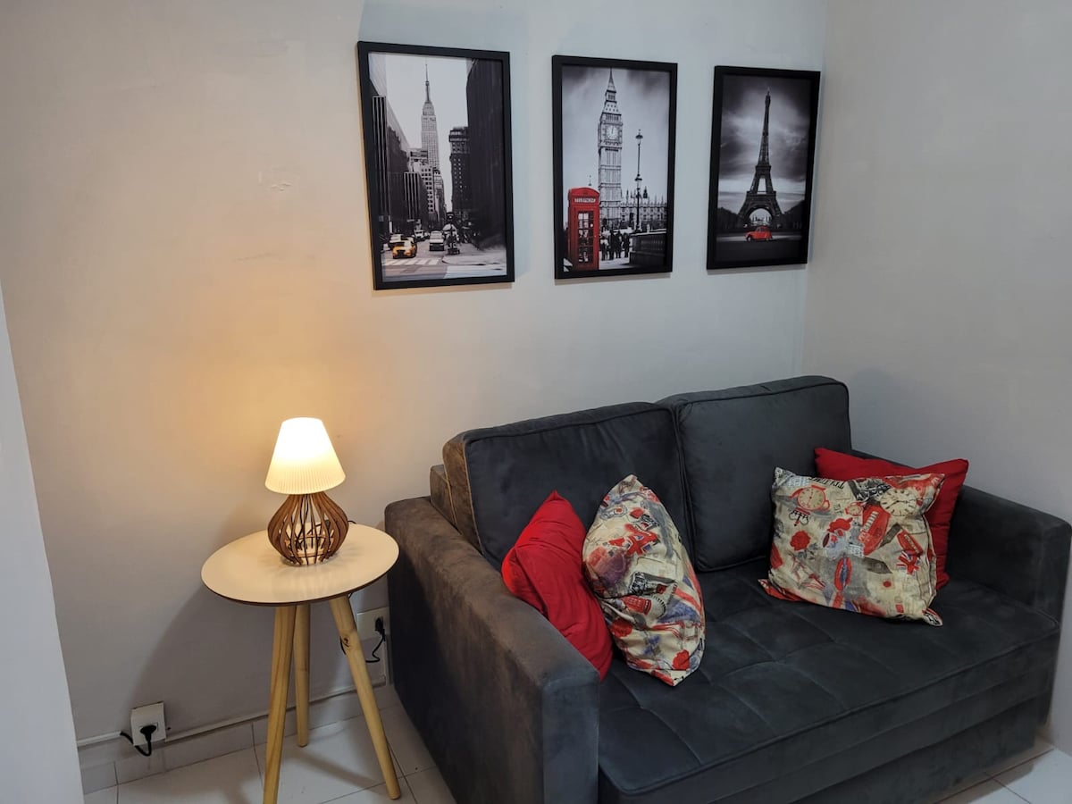 • С видом на море, просторная и очень уютная; • Отличное расположение в Итараре - все, что вам нужно вокруг (рестораны, рынки, пекарни, аптеки), возможность сделать все пешком; • Доступно 1 парковочное место - вращающийся гараж, с круглосуточными парковщиками (ключ у входа). Грузовики не допускаются. • 2 спальни -> желательно вмещают 4 человек и могут быть увеличены до 6 человек, за 75 реалов за ночь для 5 и 6 дополнительных человек; • Можно с животными -> единовременный сбор 30,00 R$/животное.