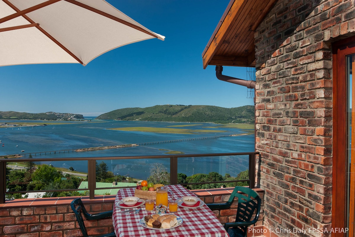 This luxury self-catering apartment consists of a lounge, kitchenette and ensuite bedroom that sleeps 2 adults. Large double doors open onto a spacious balcony with sun loungers overlooking the gorgeous views of the famous Knysna Lagoon and the Outiniqua Mountains. Guests have access to the Fynbos gardens, sunset viewing deck and firepit boma, each with their own iconic vistas. The apartment is accessed via one flight of stairs.