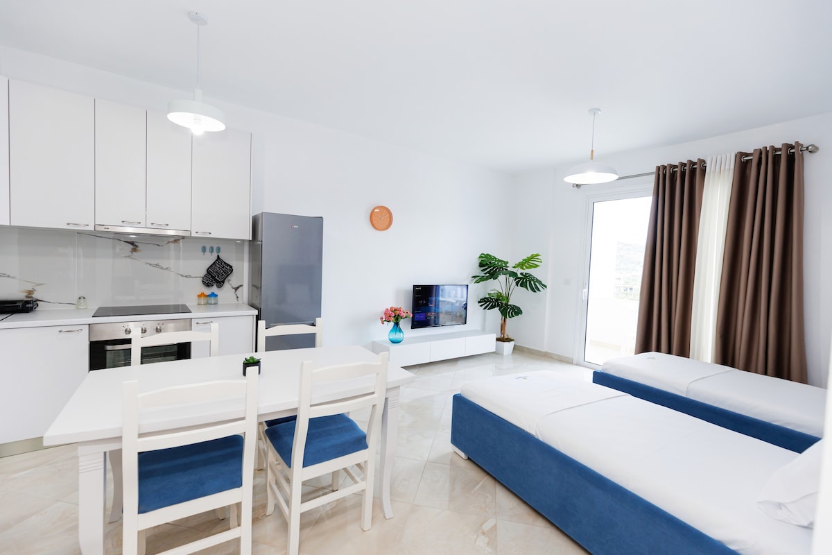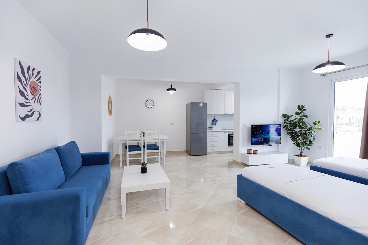 Квартира на берегу моря с прямым выходом на бесплатный пляж — Hidden Rocky Beach, общественный пляж. Просторный балкон, большой открытый диван/обеденная зона, кресла-мешки, костровая яма. 1,5 км от центра города, 15 минут пешком до бульвара/ набережной Саранды. Расположена рядом с пляжем Манго. В 10 км от национального парка Бутринт и Ксамила, автобусная остановка снаружи, в 5 км от Паскиры и пляжа Пулебардха. Аптека, рынки, рестораны, общественный/бесплатный пляж и пляжные клубы/курорты находятся рядом. Ремонт в ноябре 2025 года
