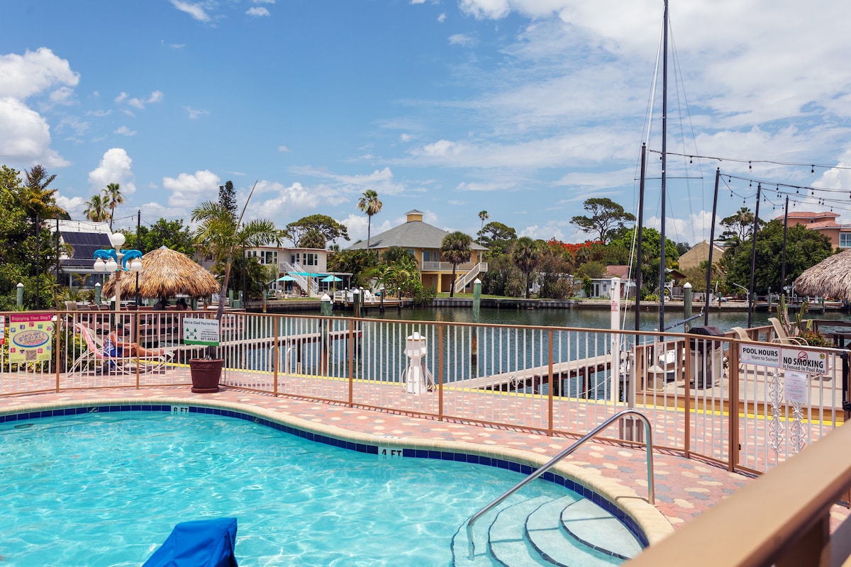Абсолютно новый и обновленный номер в гостинице - Кондо в отеле Ramada Inn на 41. Первый этаж, две большие, удобные кровати размера Queen size, 70-дюймовый телевизор Smart TV с кабельными каналами, надежный WI-FI. Абсолютно новый душ, раковина, кофейный бар с холодильником и микроволновой печью. Бассейн с подогревом, тренажерный зал, бар Tiki и гриль с ежедневной едой и напитками. Живая музыка тоже! Красивая пристань в нескольких шагах от вашей двери...Возьмите с собой лодку или возьмите ее напрокат! В нескольких минутах езды от аэропорта Пуэрто-Рико, USF, Нового колледжа, Академии IMG, центра Сарасоты, St. Armand 's Circle и всех пляжей!