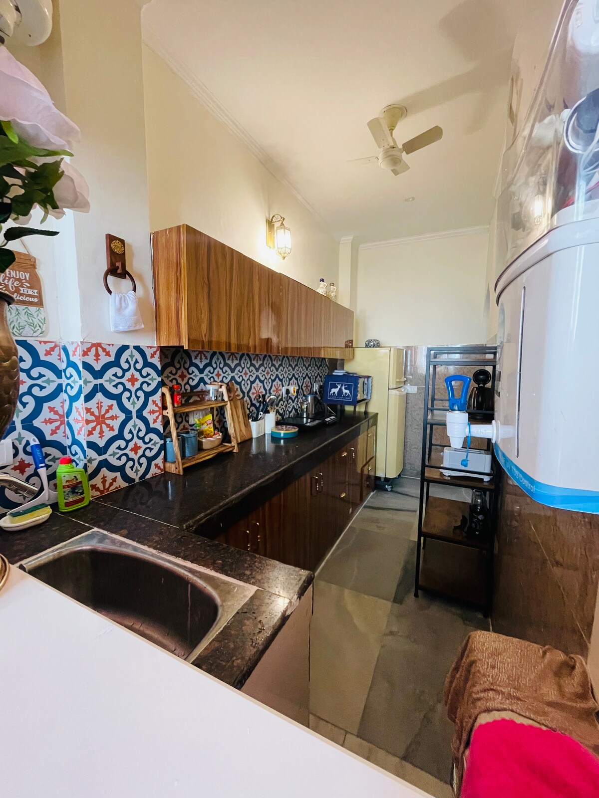 Эта просторная квартира с 1 спальней и кухней, залитая естественным светом, является спокойным местом отдыха в центре Гургаона. Всего в нескольких минутах от дороги Golf Course Road и метро HUDA, в тихом жилом районе, откуда легко добраться до города. • Открытая гостиная площадью 750 кв. футов. • Двуспальная кровать размера King size с мягким постельным бельем. • Работа + уголки для чтения + пространство для тишины • Полностью оборудованная кухня. Расположенная в семейном доме, но полностью независимая, она сочетает в себе уединение и поддержку соседей. Идеально подходит для одиноких путешественников и длительного проживания, если вы ищете спокойное место, не теряя доступа к удобствам.