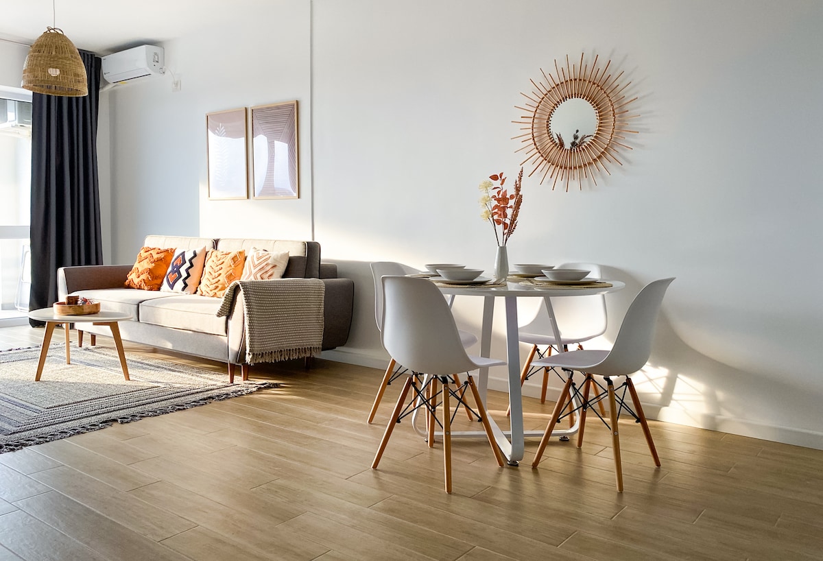 Почувствуйте роскошь в этой потрясающей квартире, украшенной темными тонами, черными цветами и элегантными золотыми акцентами. В гостиной под открытым небом есть уютный диван для 2 взрослых, идеально подходящий для отдыха. Полностью оборудованная кухня и спальня с двуспальной кроватью размера King size и стильной ванной комнатой с душевой. Выйдите на собственный балкон, откуда открывается захватывающий вид на город. Здесь есть зарезервированная парковка и легкий доступ к центру города, всего в нескольких минутах ходьбы или в 5 минутах езды, это идеальное место для отдыха в городе.