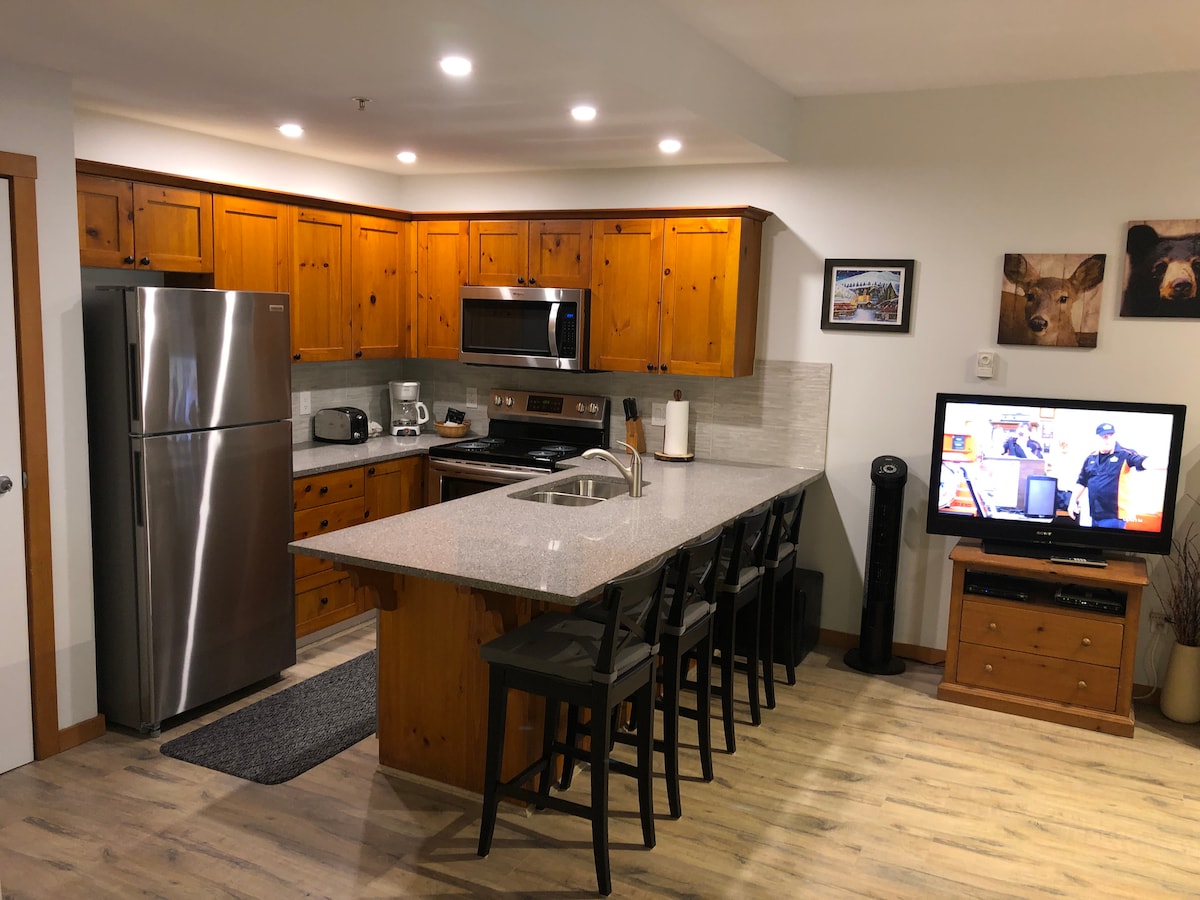 Наш кондоминиум с 1 спальней и 1 ванной комнатой с 1 спальней и 1 ванной комнатой - это мечта отдыха. Возьмите с собой водные игрушки для развлечения на озере или насладитесь короткой поездкой на велосипеде или прогуляйтесь по деревне по Долинной тропе. До деревни можно доехать всего за 5 минут. Когда вы закончите наслаждаться невероятными видами на патио, полы с подогревом и гидромассажная ванна гарантируют, что вы сможете расслабиться и расслабиться в конце насыщенного приключениями дня. Лучше не бывает!