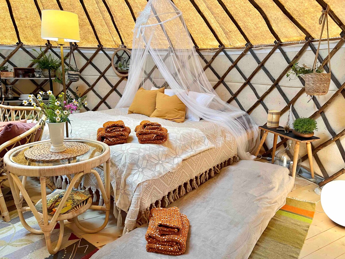 Sov i stemningsfuld jurt med udsigt til stjernerne og til havet i horisonten på vores blomstereng. Nyd et udendørs bad og tilbered din mad i vores udendørs køkken. Hils på vores mange søde dyr på gården - heste, geder, hundehvalpe og killinger. Kort gåtur ad sti til Nordsjællands bedste strande. Unik natur. Vandreruten Halsninoen går lige forbi gården. Mulighed for at tilkøbe morgenmad. Mange lækre spisesteder i området. Nær unikke Dyssekilde Økolandsby. Tog til København i gåafstand fra gården.