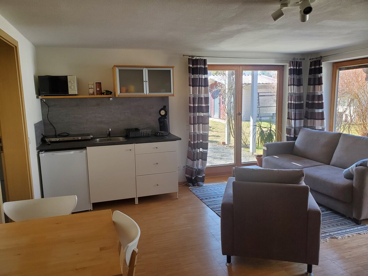 С любовью меблированная автономная квартира в тихом месте, в нескольких метрах от озера, где можно поплавать. Квартира расположена в частном доме в Альбервайлере и стратегически расположена между Биберахом, Эрингеном и Лаупхаймом. До районов Boehringer, Handtmann, Liebherr и KaVo можно добраться за 10-15 минут. Удобства: около 35 м². - Кровать 1,40 м - высококачественный диван-кровать 1,60 м (еще для 2 человек) - небольшая кухня - обеденный стол, 2 стула; - Отдельная ванная комната с душем. - Собственный вход.