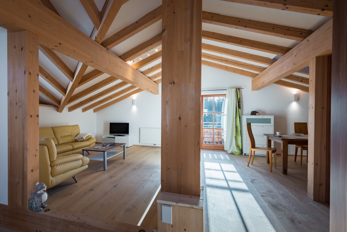 Просто наслаждайтесь жизнью в этом тихом и расположенном в центре городе доме. На мансарде нашего нового дома с террасой находится квартира площадью 54 м². Пекарь, Мясник и продуктовый магазин поблизости. До железнодорожного вокзала можно дойти пешком за 5 минут. Schliersee - за 5 минут, а Тегернзе - 15 минут. Идеально для туристов, велосипедистов, лыжников и велосипедистов. Есть частная электрическая зарядная колонна. Мы и наши 2 кошки живем в том же доме на первом и 1-м этаже. Общий вход в дом.