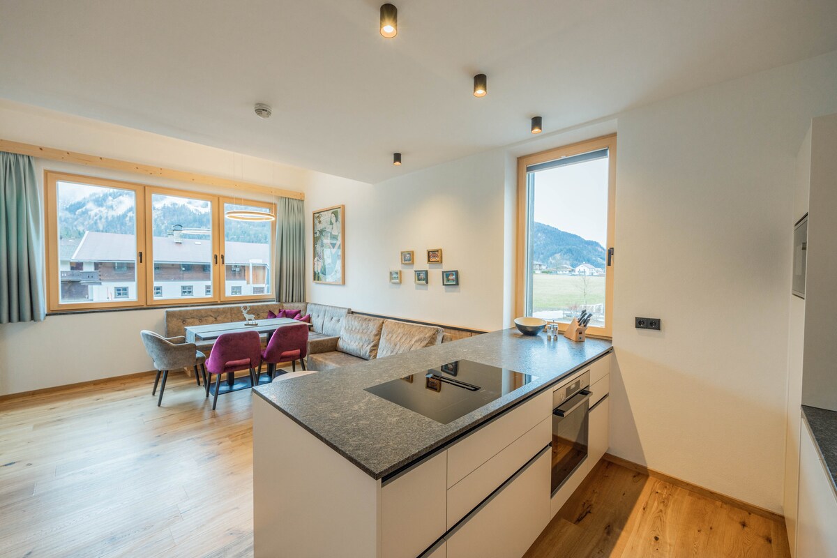 В полулюксе с видом на горы вы найдете квартиру площадью более 30 кв. м для трех человек с двуспальной кроватью размера King size и высококачественным односпальным диваном-кроватью. В квартире есть полностью оборудованная кухня с уютной гостиной зоной, роскошной ванной комнатой с большим душем и стиральной машиной-сушильной машиной и террасой площадью 10 м² с просторным сиденьем для завтрака на открытом воздухе с потрясающим видом на тирольские горы.