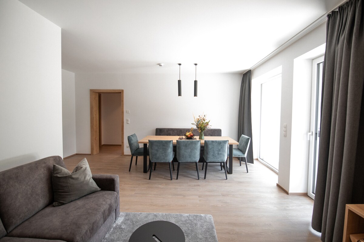 Unser hochwertiges Appartement Rotklee bietet auf 81 m² Platz für 4–7 Personen. Es verfügt über eine elegante, voll ausgestattete Küche, zwei Badezimmer, einen Vorraum mit Garderobe sowie zwei stilvolle Schlafzimmer mit Doppelbett – eines mit Zusatzbett – und eine Schlafcouch im Wohnbereich. Besonders einladend ist die großzügige Lärchenveranda mit Westblick auf den Außenpool, ideal zum Entspannen in gemütlicher Atmosphäre.