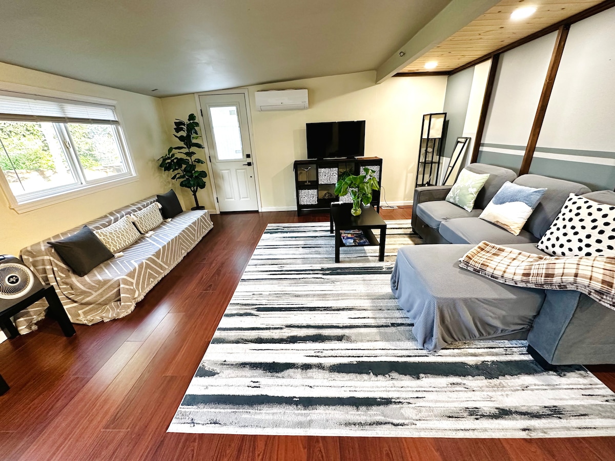 Тихая, автономная квартира-студия площадью 400 кв. футов в современном доме с ванной комнатой, кухней, отдельным входом и охраняемой парковкой с зарядным устройством для электромобилей. Комфортабельная меблировка: 1 кровать размера Queen size, 1 полноценный диван-кровать, офисный стол, медиацентр, холодильник с диспенсером для льда, плита, душ без бортиков, стиральная машина и сушилка. Большие раздвижные стеклянные двери в патио и 150-футовые кедры, деревья мадрона. Легкий доступ без лестниц и ступенек. Теплые полированные бетонные полы с подогревом, кондиционер и хорошая вентиляция.