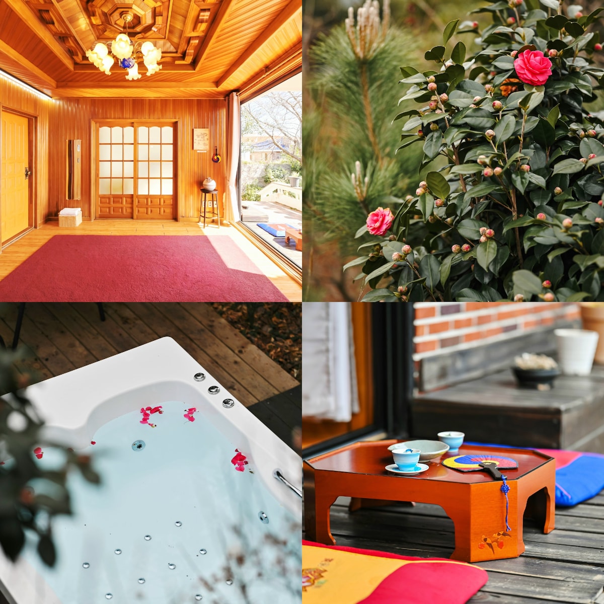 "Чеджу, где я хочу остаться на месяц или год... Я подготовил эмоциональное приспособление, где я могу чувствовать Чеджу, даже если я останусь всего на несколько дней. Вокруг каменные стены, старые деревья камелии и гвангна, поэтому она отделена от внешнего взгляда и шума.. Цветочные клумбы готовятся к цветению весной. Старый дом Чеджу был отремонтирован вручную, поэтому под тяжелыми стропилами можно найти стильные и милые аксессуары. Мы украсили окна самбе и коровьими окнами, окрашенными методом окрашивания хурмы Чеджу, и сделали стол с кедром Чеджу. Я украсил кухню красивым вулканическим камнем, который выбрал как джинжу. В небольшом пристройке на стороне двора можно выпить чай, расслабиться и поесть с джакузи. Днем под каменной стеной находится джакузи на свежем воздухе. Прогулка до моря занимает менее 5 минут, и вы можете совершить ежедневную прогулку, чтобы увидеть красивый остров Чэншань. Проведите отличный день здесь, в Чеджу.